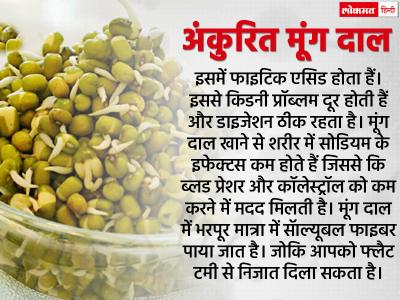 इसमें फाइटिक एसिड होता हैं। इससे किडनी प्रॉब्लम दूर होती हैं और डाइजेशन ठीक रहता है। मूंग दाल खाने से शरीर में सोडियम के इफेक्टस कम होते हैं जिससे कि ब्लड प्रेशर और कॉलेस्ट्रॉल को कम करने में मदद मिलती है। मूंग दाल में भरपूर मात्रा में सॅाल्यूबल फाइबर पाया जात है। जोकि आपको फ्लैट टमी से निजात दिला सकता है।