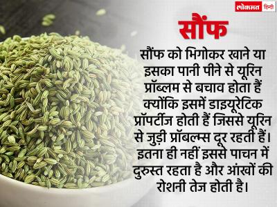 सौंफ को भिगोकर खाने या इसका पानी पीने से यूरिन प्रॉब्लम से बचाव होता हैं क्योंकि इसमें डाइयूरेटिक प्रॉपर्टीज होती हैं जिससे यूरिन से जुड़ी प्रॉबल्म्स दूर रहती हैं। इतना ही नहीं इससे पाचन में दुरुस्त रहता है और आंखों की रोशनी तेज होती है।