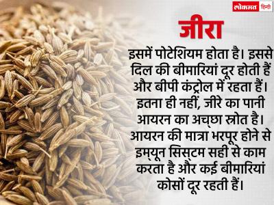 इसमें पोटेशियम होता है। इससे दिल की बीमारियां दूर होती हैं और बीपी कंट्रोल में रहता हैं। इतना ही नहीं, जीरे का पानी आयरन का अच्छा स्रोत है। आयरन की मात्रा भरपूर होने से इम्यून सिस्टम सही से काम करता है और कई बीमारियां कोसों दूर रहती हैं।
