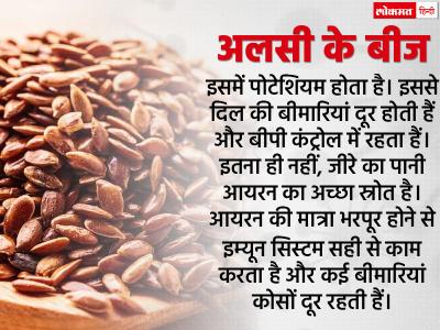 अलसी के बीजों में प्रोटीन, आयरन भरपूर होता हैं। इनको भिगोकर खाने से मसल्स टोंड होती हैं और खून की कमी पूर होती हैं। इतना ही नहीं इससे हार्ट प्रॉब्लम दूर रहती हैं और मेनोपॉज के दौरान होने वाली समस्या भी कम होती हैं।