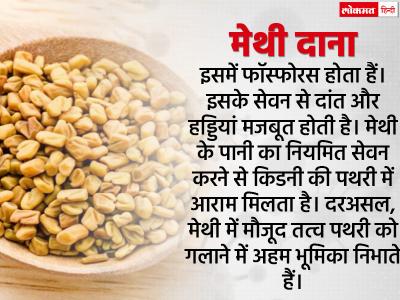 इसमें फॉस्फोरस होता हैं। इसके सेवन से दांत और हड्डियां मजबूत होती है। मेथी के पानी का नियमित सेवन करने से किडनी की पथरी में आराम मिलता है। दरअसल, मेथी में मौजूद तत्व पथरी को गलाने में अहम भूमिका निभाते हैं।