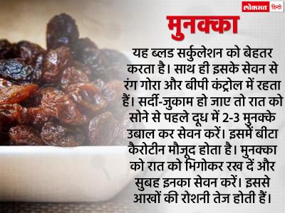 यह ब्लड सर्कुलेशन को बेहतर करता है। साथ ही इसके सेवन से रंग गोरा और बीपी कंट्रोल में रहता हैं। सर्दी-जुकाम हो जाए तो रात को सोने से पहले दूध में 2-3 मुनक्के उबाल कर सेवन करें। इसमें बीटा कैरोटीन मौजूद होता है। मुनक्का को रात को भिगोकर रख दें और सुबह इनका सेवन करें। इससे आखों की रोशनी तेज होती हैं।