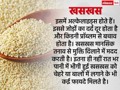 इसमें अल्केलाइड्स होते हैं। इससे जोड़ों का दर्द दूर होता है और किडनी प्रॉब्लम से बचाव होता है। खसखस मानसिक तनाव से मुक्ति दिलाने में मदद करती है। इतना ही नहीं रात भर पानी में भीगी हुई खसखस को चेहरे या बालों में लगाने के भी कई फायदे मिलते है।