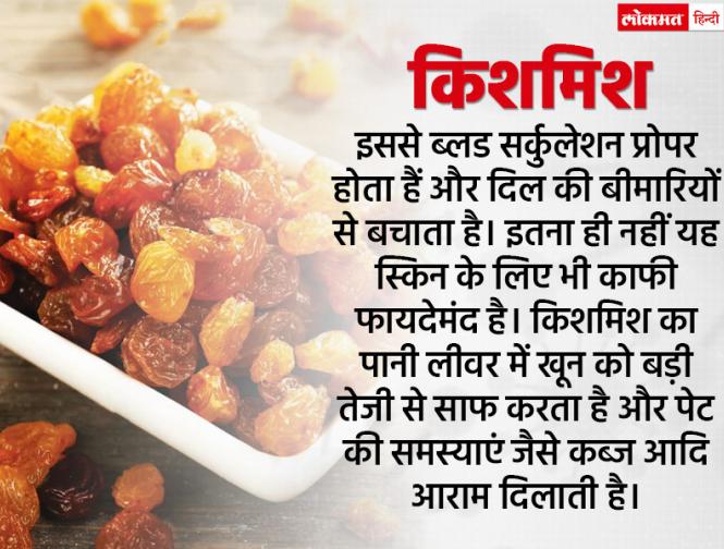 इससे ब्लड सर्कुलेशन प्रोपर होता हैं और दिल की बीमारियों से बचाता है। इतना ही नहीं यह स्किन के लिए भी काफी फायदेमंद है। किशमिश का पानी लीवर में खून को बड़ी तेजी से साफ करता है और पेट की समस्याएं जैसे कब्ज आदि आराम दिलाती है।