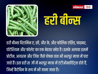अन्य सब्जियों की तरह, हरी बीन्स विटामिन ए, सी, और के, और फोलिक एसिड, फाइबर, पोटेशियम और फोलेट का एक बेहतर स्रोत है। इसके अलावा इसमें प्रोटीन, आयरन और जिंक जैसे पोषक तत्व भी भरपूर मात्रा में पाए जाते हैं। इस हरी सब्जी में भरपूर मात्रा में एंटीऑक्सीडेंट्स होते हैं, जिन्हें कैटेचिन के रूप में भी जाना जाता है। इससे आपको हार्ट डिजीज, कैंसर और डायबिटीज को रोकने में मदद मिलती है।