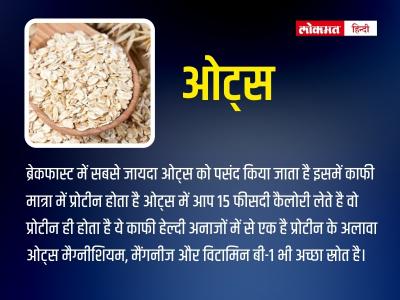 ब्रेकफास्ट में सबसे जायदा ओट्स को पसंद किया जाता है इसमें काफी मात्रा में प्रोटीन होता है ओट्स में आप 15 फीसदी कैलोरी लेते है वो प्रोटीन ही होता है ये काफी हेल्दी अनाजों में से एक है प्रोटीन के अलावा ओट्स मैग्नीशियम, मैंगनीज और विटामिन बी-1 भी अच्छा स्रोत है।
