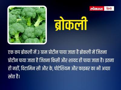 एक कप ब्रोकली में 3 ग्राम प्रोटीन पाया जाता है ब्रोकली में जितना प्रोटीन पाया जाता है जितना किसी और शायद ही पाया जाता है। इतना ही नहीं, विटामिन सी और के, पोटेशियम और फाइबर का भी अच्छा स्रोत है।