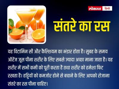 यह विटामिन सी और कैल्शियम का भंडार होता है। सुबह के समय ऑरेंज जूस पीना शरीर के लिए सबसे ज्यादा अच्छा माना जाता है। यह शरीर में सभी कमी को पूरी करता है तथा शरीर को हमेशा फिट रखता है। हड्डियों को कमजोर होने से बचाने के लिए आपको रोजाना संतरे का रस पीना चाहिए।