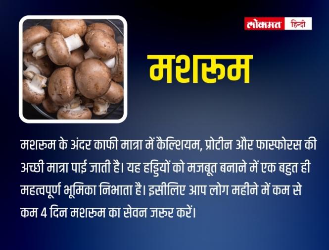 मशरूम के अंदर काफी मात्रा में कैल्शियम, प्रोटीन और फास्फोरस की अच्छी मात्रा पाई जाती है। यह हड्डियों को मजबूत बनाने में एक बहुत ही महत्वपूर्ण भूमिका निभाता है। इसीलिए आप लोग महीने में कम से कम 4 दिन मशरूम का सेवन जरूर करें।