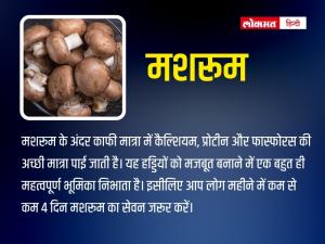 1 / 8मशरूम के अंदर काफी मात्रा में कैल्शियम, प्रोटीन और फास्फोरस की अच्छी मात्रा पाई जाती है। यह हड्डियों को मजबूत बनाने में एक बहुत ही महत्वपूर्ण भूमिका निभाता है। इसीलिए आप लोग महीने में कम से कम 4 दिन मशरूम का सेवन जरूर करें।2 / 8यह प्रोटीन का सबसे बेहतर स्रोत है। अगर कोई व्यक्ति मांसाहारी है, तो वह व्यक्ति अंडे का अंदर का पीला भाग खा सकता है। अंडे के पीले भाग के अंदर काफी मात्रा में पोषक तत्व पाए जाते हैं जो हड्डियों को मजबूती प्रदान करते हैं।3 / 8अन्य सब्जियों की तरह, हरी बीन्स विटामिन ए, सी, और के, और फोलिक एसिड, फाइबर, पोटेशियम और फोलेट का एक बेहतर स्रोत है। इसके अलावा इसमें प्रोटीन, आयरन और जिंक जैसे पोषक तत्व भी भरपूर मात्रा में पाए जाते हैं। इस हरी सब्जी में भरपूर मात्रा में एंटीऑक्सीडेंट्स होते हैं, जिन्हें कैटेचिन के रूप में भी जाना जाता है। इससे आपको हार्ट डिजीज, कैंसर और डायबिटीज को रोकने में मदद मिलती है।4 / 8भुने हुए काले चने कैल्शियम का एक बहुत बड़ा स्त्रोत होती है। इसका सेवन करने से कैल्शियम की पूर्ति काफी तेजी से होती हैं और हड्डियां स्ट्रांग हो जाती है। कहा जाता है कि इसके सेवन से खून की कमी भी दूर हो सकती है। 5 / 8ब्रेकफास्ट में सबसे जायदा ओट्स को पसंद किया जाता है इसमें काफी मात्रा में प्रोटीन होता है ओट्स में आप 15 फीसदी कैलोरी लेते है वो प्रोटीन ही होता है ये काफी हेल्दी अनाजों में से एक है प्रोटीन के अलावा ओट्स मैग्नीशियम, मैंगनीज और विटामिन बी-1 भी अच्छा स्रोत है।6 / 8एक कप ब्रोकली में 3 ग्राम प्रोटीन पाया जाता है ब्रोकली में जितना प्रोटीन पाया जाता है जितना किसी और शायद ही पाया जाता है। इतना ही नहीं, विटामिन सी और के, पोटेशियम और फाइबर का भी अच्छा स्रोत है।7 / 8यह विटामिन सी और कैल्शियम का भंडार होता है। सुबह के समय ऑरेंज जूस पीना शरीर के लिए सबसे ज्यादा अच्छा माना जाता है। यह शरीर में सभी कमी को पूरी करता है तथा शरीर को हमेशा फिट रखता है। हड्डियों को कमजोर होने से बचाने के लिए आपको रोजाना संतरे का रस पीना चाहिए। 8 / 8चिकन ब्रेस्ट को अगर बिना स्किन के खाया जाये तो यह प्रोटीन का काफी अच्छा स्रोत होता है 154 ग्राम टूना फिश में 39 ग्राम प्रोटीन पाया जाता है लीन बीफ भी प्रोटीन का बढि़या स्रोत माना जाता है।