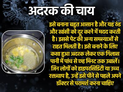 इसे बनाना बहुत आसान है और यह ठंड और खांसी को दूर करने में मदद करती है। इससे पेट की अन्य समस्याओं से राहत मिलती है। इसे बनाने के लिए कसा हुआ अदरक लेकर एक गिलास पानी में पांच से छह मिनट तक उबालें। जिन लोगों को हाइपरसिडिटी या उच्च रक्तचाप है, उन्हें इसे पीने से पहले अपने डॉक्टर से परामर्श करना चाहिए
