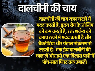 दालचीनी की चाय वजन घटाने में मदद करती है, हृदय रोग के जोखिम को कम करती है, रक्त शर्करा को बनाए रखने में मदद करती है और बैक्टीरिया और फंगल संक्रमण से लड़ती है। एक इंच दालचीनी की छाल लें और इसे एक गिलास पानी में पाँच-सात मिनट तक उबालें।