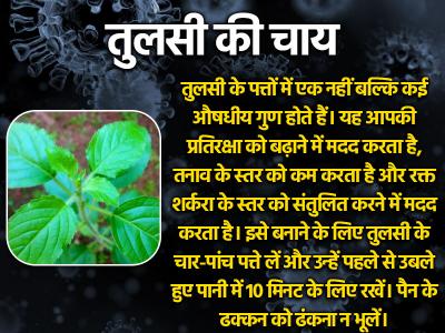 तुलसी के पत्तों में एक नहीं बल्कि कई औषधीय गुण होते हैं। यह आपकी प्रतिरक्षा को बढ़ाने में मदद करता है, तनाव के स्तर को कम करता है और रक्त शर्करा के स्तर को संतुलित करने में मदद करता है। इसे बनाने के लिए तुलसी के चार-पांच पत्ते लें और उन्हें पहले से उबले हुए पानी में 10 मिनट के लिए रखें। पैन के ढक्कन को ढंकना न भूलें।