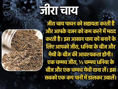 जीरा चाय पाचन को सहायता करती है और आपके वजन को कम करने में मदद करती है। इस आसान चाय को बनाने के लिए आपको जीरा, धनिया के बीज और मेथी के बीज की आवश्यकता होगी। एक चम्मच जीरा, ½ चम्मच धनिया के बीज और एक चम्मच मेथी दाना लें। इस सबको एक कप पानी में डालकर उबालें।