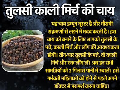 यह चाय इम्यून बूस्टर है और मौसमी संक्रमणों से लड़ने में मदद करती है। इस चाय को बनाने के लिए आपको तुलसी के पत्ते, काली मिर्च और लौंग की आवश्यकता होगी। तीन-चार तुलसी के पत्ते, दो काली मिर्च और एक लौंग लें। अब इन सभी सामग्रियों को 2 गिलास पानी में उबालें। इसे गर्भवती महिलाओं को होने से पहले अपने डॉक्टर से परामर्श करना चाहिए।