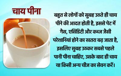 बहुत से लोगों को सुबह उठते ही चाय पीने की आदत होती है, इससे पेट में गैस, एसिडिटी और कब्ज जैसी परेशानियां होने का खतरा बढ़ जाता है, इसलिए सुबह उठकर सबसे पहले पानी पीना चाहिए, उसके बाद ही चाय या किसी अन्य चीज का सेवन करें।