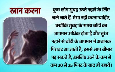 कुछ लोग सुबह उठते नहाने के लिए चले जाते हैं, ऐसा नही करना चाहिए, क्योंकि सुबह के समय बॉडी का तापमान अधिक होता है और तुरंत नहाने से बॉडी के तापमान में अचानक गिरावट आ जाती है, इससे आप बीमार पड़ सकते हैं, इसलिए उठने के कम से कम 20 से 25 मिनट के बाद ही नहायें।