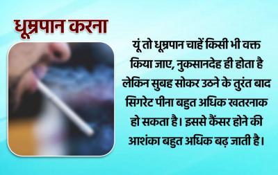 यूं तो धूम्रपान चाहें किसी भी वक्त किया जाए, नुकसानदेह ही होता है लेकिन सुबह सोकर उठने के तुरंत बाद सिगरेट पीना बहुत अधिक खतरनाक हो सकता है। इससे कैंसर होने की आशंका बहुत अधिक बढ़ जाती है।