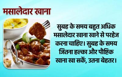 सुबह के समय बहुत अधिक मसालेदार खाना खाने से परहेज करना चाहिए। सुबह के समय जितना हल्का और पौष्टिक खाना खा सकें, उतना बेहतर।