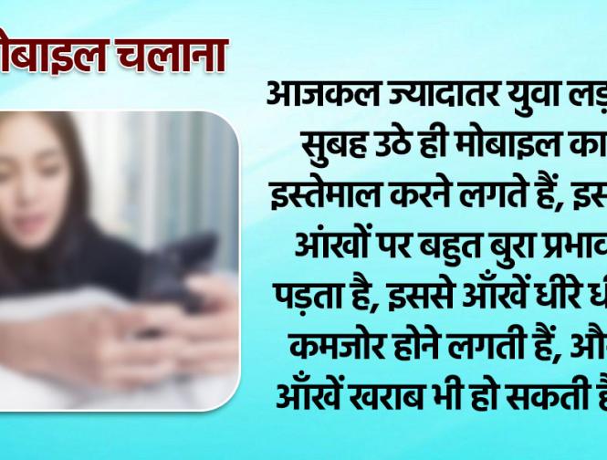 आजकल ज्यादातर युवा लड़के सुबह उठे ही मोबाइल का इस्तेमाल करने लगते हैं, इससे आंखों पर बहुत बुरा प्रभाव पड़ता है, इससे आँखें धीरे धीरे कमजोर होने लगती हैं, और आँखें खराब भी हो सकती हैं।