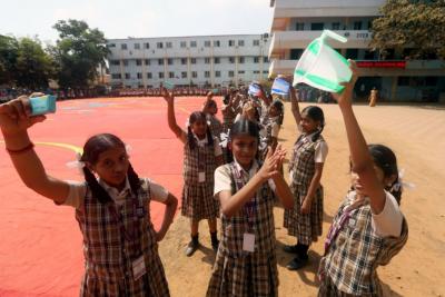 कोरोना से बचने के उपायों की जानकारी देती स्कूली छात्राएं