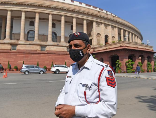 कोरोना का कहर, मास्क लगाकर ड्यूटी कर रहे हैं ट्रैफिक पुलिसकर्मी