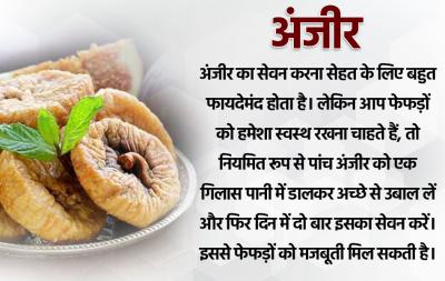 अंजीर का सेवन करना सेहत के लिए बहुत फायदेमंद होता है। लेकिन आप फेफड़ों को हमेशा स्वस्थ रखना चाहते हैं, तो नियमित रूप से पांच अंजीर को एक गिलास पानी में डालकर अच्छे से उबाल लें और फिर दिन में दो बार इसका सेवन करें। इससे फेफड़ों को मजबूती मिल सकती है।