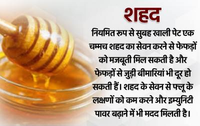 नियमित रूप से सुबह खाली पेट एक चम्मच शहद का सेवन करने से फेफड़ों को मजबूती मिल सकती है और फेफड़ों से जुड़ी बीमारियां भी दूर हो सकती हैं। शहद के सेवन से फ्लू के लक्षणों को कम करने और इम्युनिटी पावर बढ़ाने में भी मदद मिलती है।