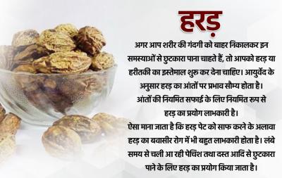 अगर आप शरीर की गंदगी को बाहर निकालकर इन समस्याओं से छुटकारा पाना चाहते हैं, तो आपको हरड़ या हरीतकी का इस्तेमाल शुरू कर देना चाहिए। आयुर्वेद के अनुसार हरड़ का आंतों पर प्रभाव सौम्य होता है। आंतों की नियमित सफाई के लिए नियमित रूप से हरड़ का प्रयोग लाभकारी है।