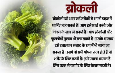ब्रोकोली को आप कई तरीकों से अपनी डाइट में शामिल कर सकते हैं। आप इसे फ्राई करके और चिकन के साथ ले सकते हैं। आप ब्रोकोली और फूलगोभी पुलाव भी बना सकते हैं। इसके आलाव इसे उबालकर सलाद के रूप में भी खाया जा सकता है। इसमें वो सभी पोषक तत्व होते हैं जो शरीर के लिए जरूरी हैं। इसे पचाना आसान है जिस वजह से यह पेट के लिए बेहतर सब्जी है।
