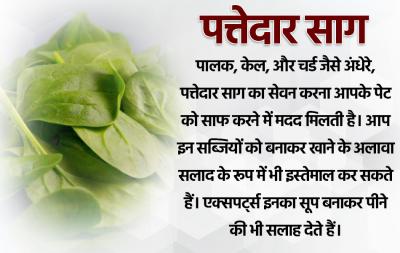 पालक, केल, और चर्ड जैसे अंधेरे, पत्तेदार साग का सेवन करना आपके पेट को साफ करने में मदद मिलती है। आप इन सब्जियों को बनाकर खाने के अलावा सलाद के रूप में भी इस्तेमाल कर सकते हैं। एक्सपर्ट्स इनका सूप बनाकर पीने की भी सलाह देते हैं।