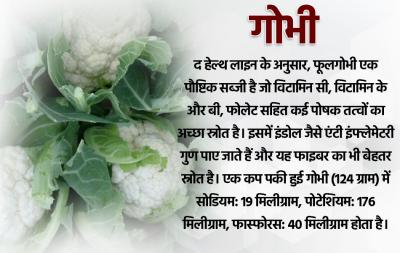 द हेल्थ लाइन के अनुसार, फूलगोभी एक पौष्टिक सब्जी है जो विटामिन सी, विटामिन के और बी, फोलेट सहित कई पोषक तत्वों का अच्छा स्रोत है। इसमें इंडोल जैसे एंटी इंफ्लेमेटरी गुण पाए जाते हैं और यह फाइबर का भी बेहतर स्रोत है। एक कप पकी हुई गोभी (124 ग्राम) में सोडियम: 19 मिलीग्राम, पोटेशियम: 176 मिलीग्राम, फास्फोरस: 40 मिलीग्राम होता है।