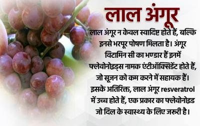 लाल अंगूर न केवल स्वादिष्ट होते हैं, बल्कि इनसे भरपूर पोषण मिलता है। अंगूर विटामिन सी का भण्डार हैं इनमें फ्लेवोनोइड्स नामक एंटीऑक्सिडेंट होते हैं, जो सूजन को कम करने में सहायक हैं। इसके अतिरिक्त, लाल अंगूर resveratrol में उच्च होते हैं, एक प्रकार का फ्लेवोनोइड जो दिल के स्वास्थ्य के लिए जरूरी है।
