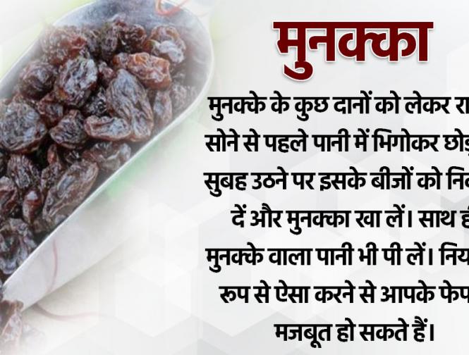 मुनक्के के कुछ दानों को लेकर रात में सोने से पहले पानी में भिगोकर छोड़ दें। सुबह उठने पर इसके बीजों को निकाल दें और मुनक्का खा लें। साथ ही मुनक्के वाला पानी भी पी लें। नियमित रूप से ऐसा करने से आपके फेफड़े मजबूत हो सकते हैं।