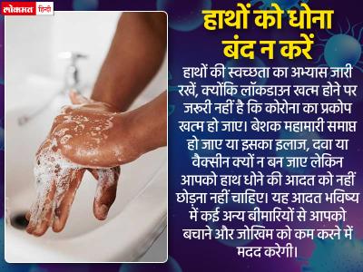 हाथों की स्वच्छता का अभ्यास जारी रखें, क्योंकि लॉकडाउन खत्म होने पर जरूरी नहीं है कि कोरोना का प्रकोप खत्म हो जाए। बेशक महामारी समाप्त हो जाए या इसका इलाज, दवा या वैक्सीन क्यों न बन जाए लेकिन आपको हाथ धोने की आदत को नहीं छोड़ना नहीं चाहिए। यह आदत भविष्य में कई अन्य बीमारियों से आपको बचाने और जोखिम को कम करने में मदद करेगी।