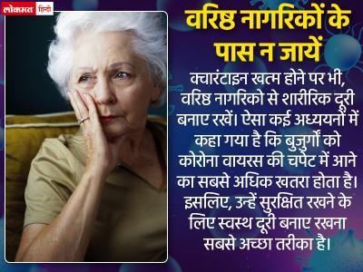 क्वारंटाइन खत्म होने पर भी, वरिष्ठ नागरिको से शारीरिक दूरी बनाए रखें। ऐसा कई अध्ययनों में कहा गया है कि बुजुर्गों को कोरोना वायरस की चपेट में आने का सबसे अधिक खतरा होता है। इसलिए, उन्हें सुरक्षित रखने के लिए स्वस्थ दूरी बनाए रखना सबसे अच्छा तरीका है।