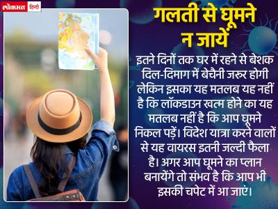 इतने दिनों तक घर में रहने से बेशक दिल-दिमाग में बेचैनी जरूर होगी लेकिन इसका यह मतलब यह नहीं है कि लॉकडाउन खत्म होने का यह मतलब नहीं है कि आप घूमने निकल पड़ें। विदेश यात्रा करने वालों से यह वायरस इतनी जल्दी फैला है। अगर आप घूमने का प्लान बनायेंगे तो संभव है कि आप भी इसकी चपेट में आ जाएं।