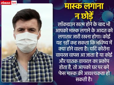 लॉकडाउन खत्म होने के बाद भी आपको मास्क लगाने के आदत को लगातार जारी रखना होगा। कोई यह नहीं कह सकता कि भविष्य में क्या होने वाला है। यदि कोरोना वायरस वापस आ जाता है या कोई और घातक वायरल का प्रकोप होता है, तो आपको घर पर बने फेस मास्क की आवश्यकता हो सकती है।