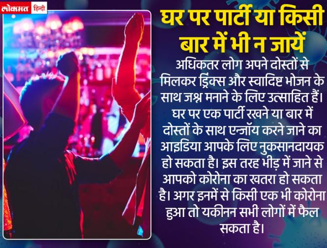 अधिकतर लोग अपने दोस्तों से मिलकर ड्रिंक्स और स्वादिष्ट भोजन के साथ जश्न मनाने के लिए उत्साहित हैं। घर पर एक पार्टी रखने या बार में दोस्तों के साथ एन्जॉय करने जाने का आइडिया आपके लिए नुकसानदायक हो सकता है। इस तरह भीड़ में जाने से आपको कोरोना का खतरा हो सकता है। अगर इनमें से किसी एक भी कोरोना हुआ तो यकीनन सभी लोगों में फैल सकता है।