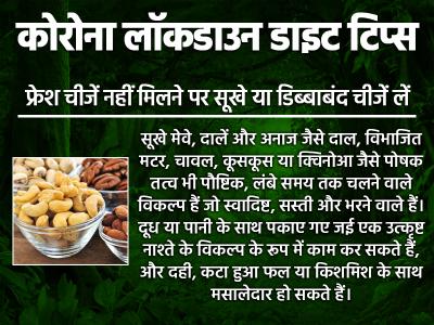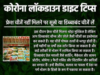 इस दौरान फ्रेश चीजें मिलना थोड़ा मुश्किल है लेकिन आप डिब्बाबंद बीन्स और छोले जैसी चीजों का इस्तेमाल कर सकते हैं। यह चीजें पोषक तत्वों से भरपूर होती हैं। इन्हें महीनों या वर्षों तक स्टोर किया जा सकता है और कई तरीकों से भोजन में शामिल किया जा सकता है। डिब्बाबंद तेल मछली जैसे सार्डिन, मैकेरल और सामन प्रोटीन, ओमेगा 3 फैटी एसिड और विटामिन और खनिजों का भण्डार हैं। इन्हें सैंडविच, सलाद या पास्ता में ठंडा या गर्म भोजन के हिस्से के रूप में पकाया जा सकता है।
