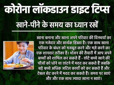 खाना बनाना और खाना अपने परिवार की दिनचर्या का एक मजेदार और सार्थक हिस्सा है। एक साथ खाना परिवार के बंधन को मजबूत करने और मज़े करने का एक शानदार तरीका है। भोजन की तैयारी में आप अपने बच्चों को शामिल कर सकते हैं - छोटे बच्चे खाने की चीजों को धोने या छांटने में मदद कर सकते हैं जबकि बड़े बच्चे अधिक जटिल कार्यों को कर सकते हैं और टेबल सेट करने में मदद कर सकते हैं। समय पर खाएं और और एक साथ ज्यादा खाना न खाएं।