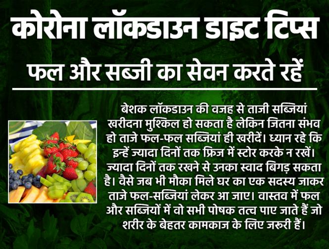बेशक लॉकडाउन की वजह से ताजी सब्जियां खरीदना मुश्किल हो सकता है लेकिन जितना संभव हो ताजे फल-फल सब्जियां ही खरीदें। ध्यान रहे कि इन्हें ज्यादा दिनों तक फ्रिज में स्टोर करके न रखें। ज्यादा दिनों तक रखने से उनका स्वाद बिगड़ सकता है। वैसे जब भी मौका मिले घर का एक सदस्य जाकर ताजे फल-सब्जियां लेकर आ जाए। वास्तव में फल और सब्जियों में वो सभी पोषक तत्व पाए जाते हैं जो शरीर के बेहतर कामकाज के लिए जरूरी हैं।