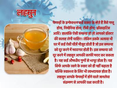फेफड़ों के इन्फेक्शन कई प्रकार के होते हैं जैसे फ्लू होना, निमोनिया होना, टीवी होना, ब्रोंकाइटिस आदि। हालांकि ऐसी समस्या हो तो आपको डॉक्टर की सलाह लेनी चाहिए। लेकिन इसके अलावा भी घर में कई ऐसी चीजें मौजूद होती है जो इस समस्या को दूर करने में मददगार होती है। इस समस्या को दूर करने में लहसुन आपकी काफी मदद कर सकता है। यह कई औषधीय गुणों से भरपूर होता है। यह सिर्फ आपके खाने के स्वाद को ही नहीं बढ़ाता है बल्कि स्वास्थ्य के लिए भी लाभदायक होता है। लहसुन आपके फेफड़ों में होने वाले जानलेवा संक्रमण से आपकी रक्षा करती है।