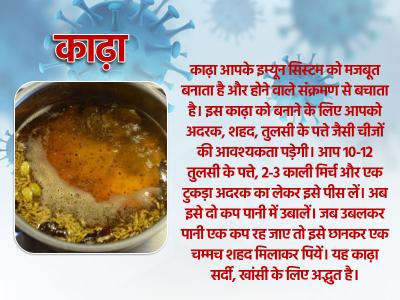 काढ़ा आपके इम्यून सिस्टम को मजबूत बनाता है और होने वाले संक्रमण से बचाता है। इस काढ़ा को बनाने के लिए आपको अदरक, शहद, तुलसी के पत्ते जैसी चीजों की आवश्यकता पड़ेगी। आप 10-12 तुलसी के पत्ते, 2-3 काली मिर्च और एक टुकड़ा अदरक का लेकर इसे पीस लें। अब इसे दो कप पानी में उबालें। जब उबलकर पानी एक कप रह जाए तो इसे छानकर एक चम्मच शहद मिलाकर पियें। यह काढ़ा सर्दी, खांसी के लिए अद्भुत है।