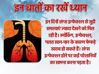 इन दिनों लंग्स इन्फेक्शन से जुड़ी समस्याएं ज्यादा देखने को मिल रही है। स्मॉकिंग, इन्फेक्शन, गलत खान-पान के कारण फेफड़े खराब हो सकते हैं। लंग्स इन्फेक्शन होने पर कई परेशानियों का सामना करना पड़ता है।