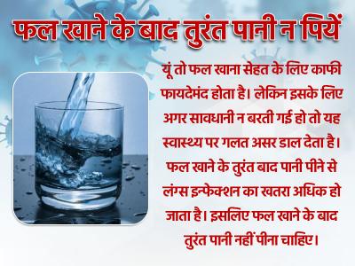 यूं तो फल खाना सेहत के लिए काफी फायदेमंद होता है। लेकिन इसके लिए अगर सावधानी न बरती गई हो तो यह स्वास्थ्य पर गलत असर डाल देता है। फल खाने के तुरंत बाद पानी पीने से लंग्स इन्फेक्शन का खतरा अधिक हो जाता है। इसलिए फल खाने के बाद तुरंत पानी नहीं पीना चाहिए।