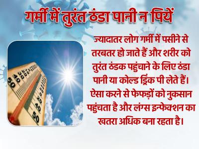 ज्यादातर लोग गर्मी में पसीने से तरबतर हो जाते हैं और शरीर को तुरंत ठंडक पहुंचाने के लिए ठंडा पानी या कोल्ड ड्रिंक पी लेते हैं। ऐसा करने से फेफड़ों को नुकसान पहुंचता है और लंग्स इन्फेक्शन का खतरा अधिक बना रहता है।
