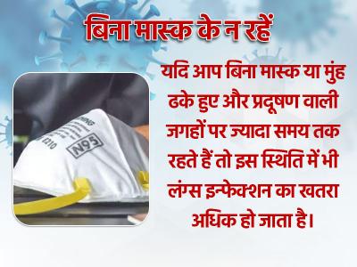 यदि आप बिना मास्क या मुंह ढके हुए और प्रदूषण वाली जगहों पर ज्यादा समय तक रहते हैं तो इस स्थिति में भी लंग्स इन्फेक्शन का खतरा अधिक हो जाता है।