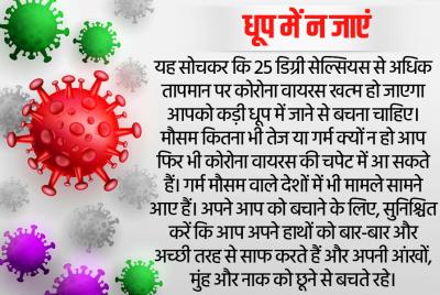WHOके अनुसार, यह सोचकर कि 25 डिग्री सेल्सियस से अधिक तापमान पर कोरोना वायरस खत्म हो जाएगा आपको कड़ी धूप में जाने से बचना चाहिए। मौसम कितना भी तेज या गर्म क्यों न हो आप फिर भी कोरोना वायरस की चपेट में आ सकते हैं। गर्म मौसम वाले देशों में भी मामले सामने आए हैं। अपने आप को बचाने के लिए, सुनिश्चित करें कि आप अपने हाथों को बार-बार और अच्छी तरह से साफ करते हैं और अपनी आंखों, मुंह और नाक को छूने से बचते रहे।