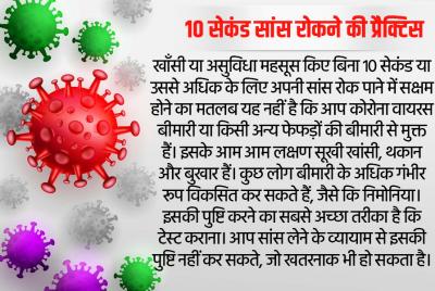 खाँसी या असुविधा महसूस किए बिना 10 सेकंड या उससे अधिक के लिए अपनी सांस रोक पाने में सक्षम होने का मतलब यह नहीं है कि आप कोरोना वायरस बीमारी या किसी अन्य फेफड़ों की बीमारी से मुक्त हैं। इसके आम आम लक्षण सूखी खांसी, थकान और बुखार हैं। कुछ लोग बीमारी के अधिक गंभीर रूप विकसित कर सकते हैं, जैसे कि निमोनिया। इसकी पुष्टि करने का सबसे अच्छा तरीका है कि टेस्ट कराना। आप सांस लेने के व्यायाम से इसकी पुष्टि नहीं कर सकते, जो खतरनाक भी हो सकता है।